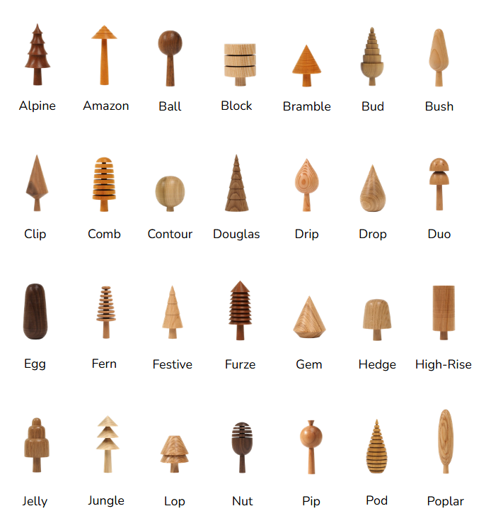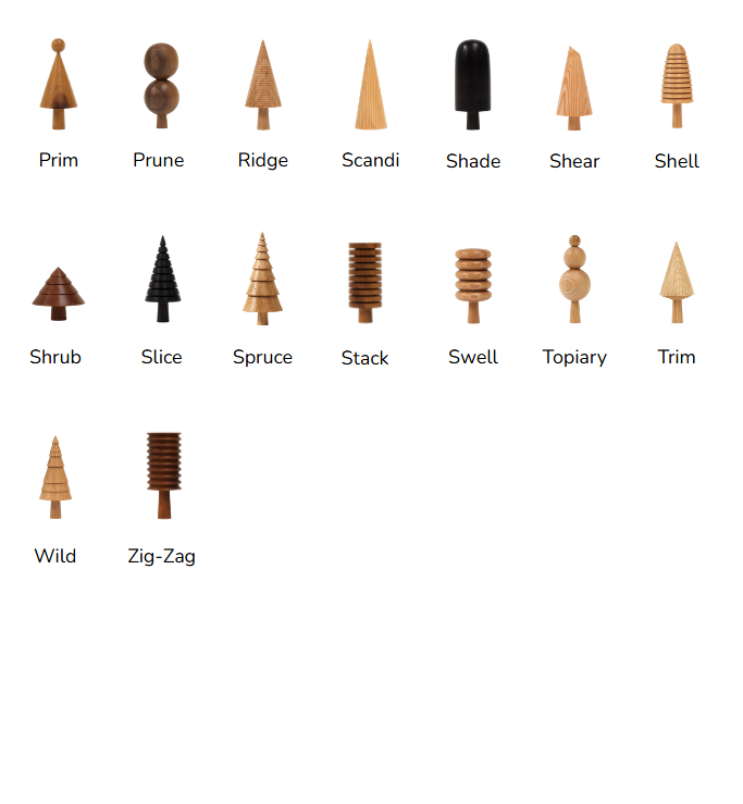 Sizing ~ The size of the Trees vary as each one is unique and individually hand turned. Most shapes stand approximately 12cm tall and are 5cm wide. Shapes such as Shrub, Lop, Bramble and Hedge are shorter and wider approximately 8cm tall and 7cm wide.