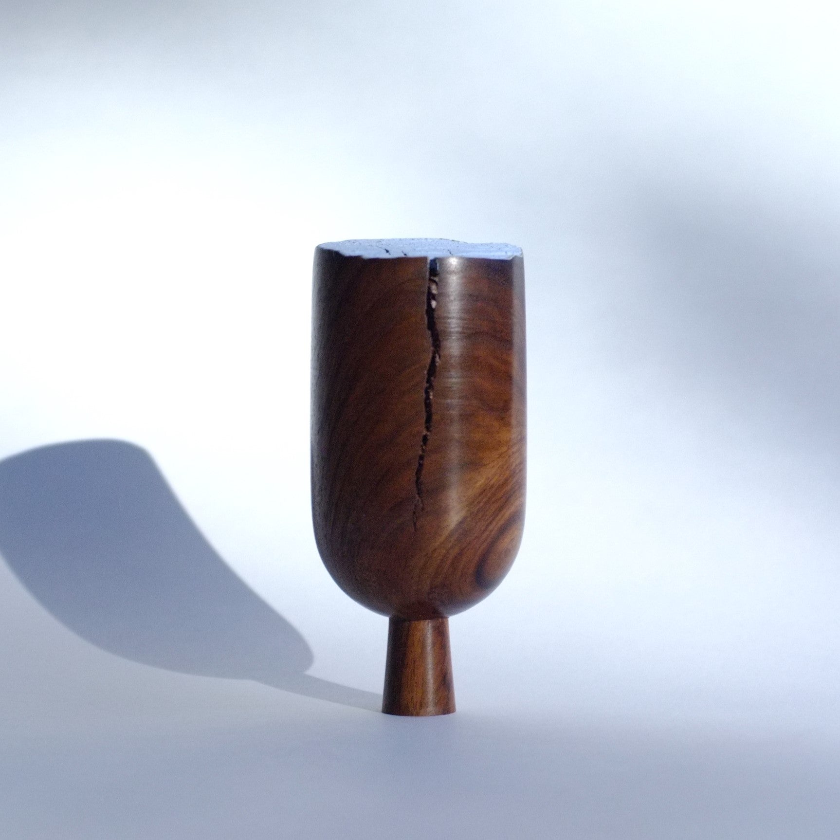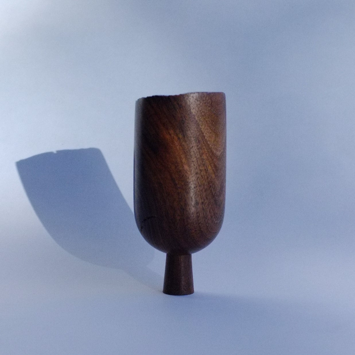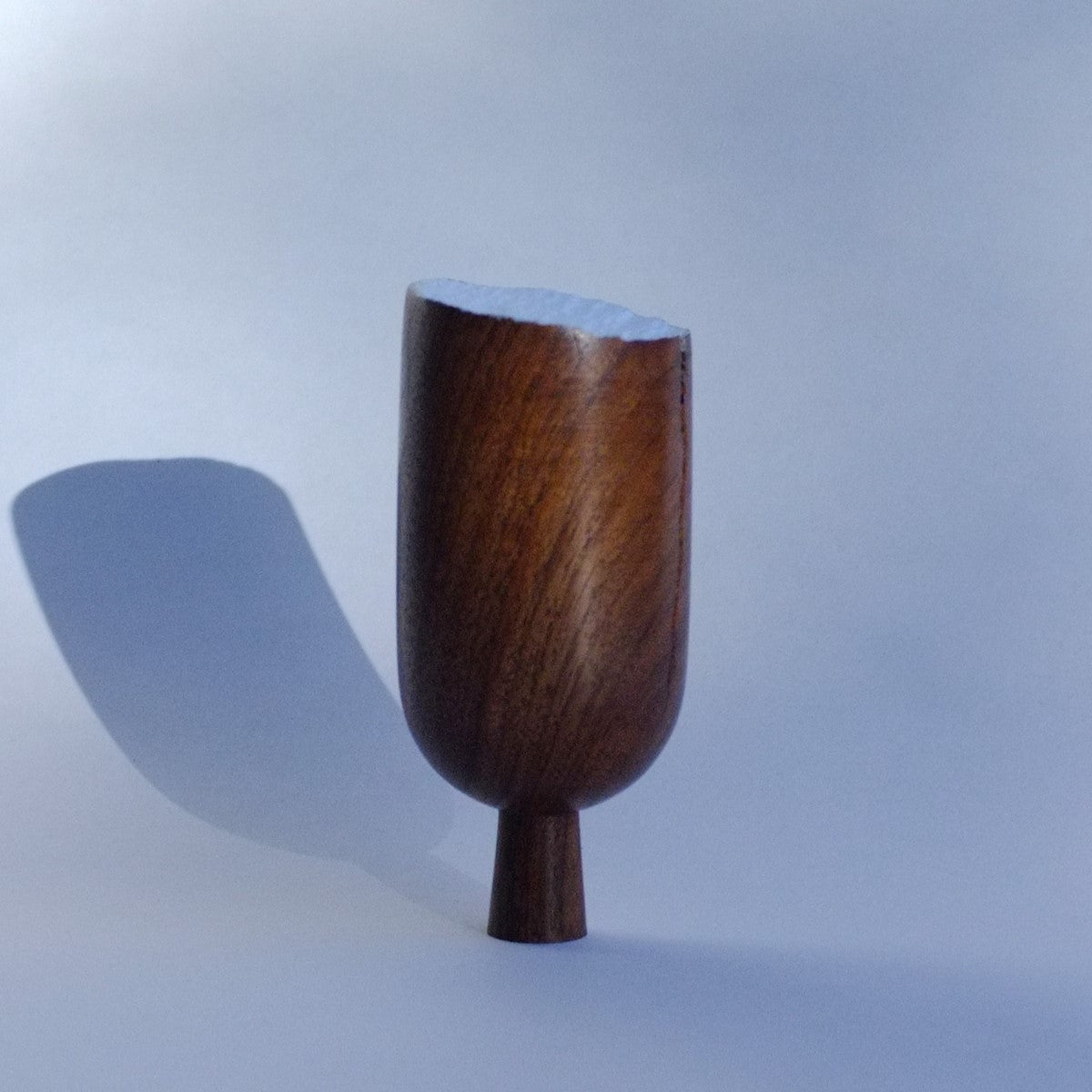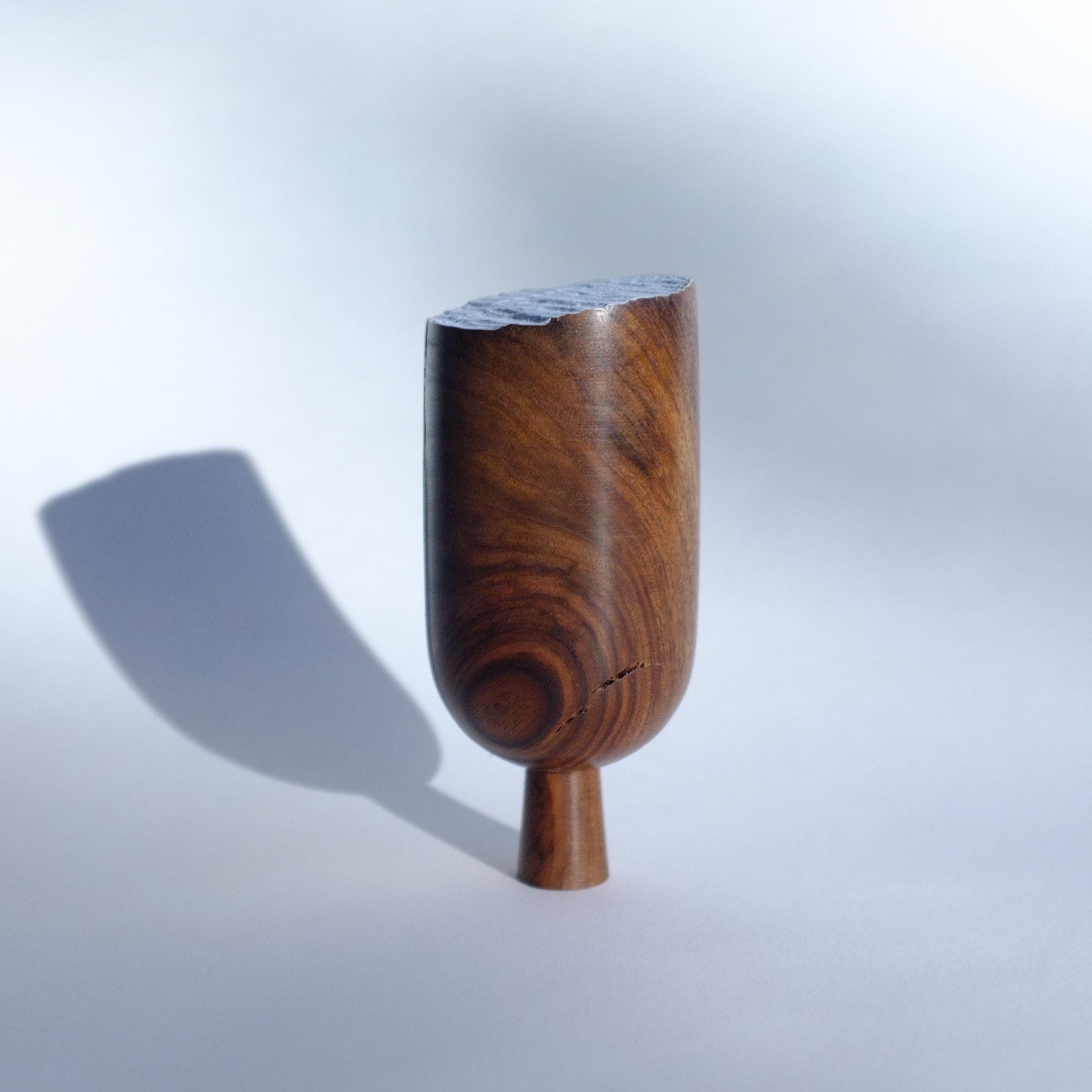 A handturned walnut Tree with a slanted cut-off top, finished with blue paint for a subtle pop of colour against the rich wood grain.