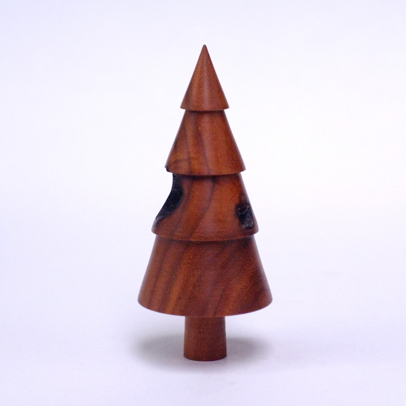 A walnut Festive Tree featuring a prominent knot hole straight through the middle, adding character and intrigue.