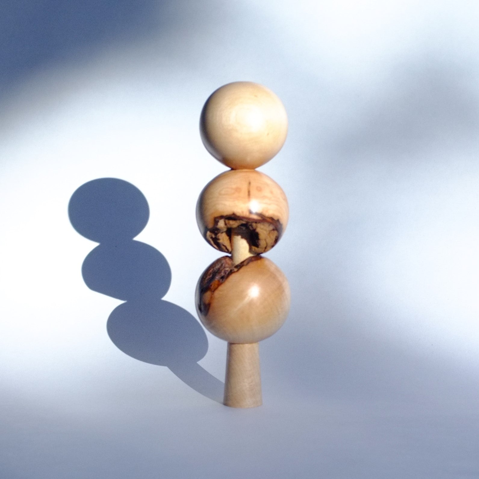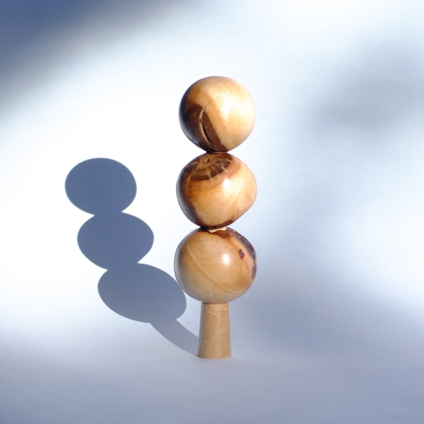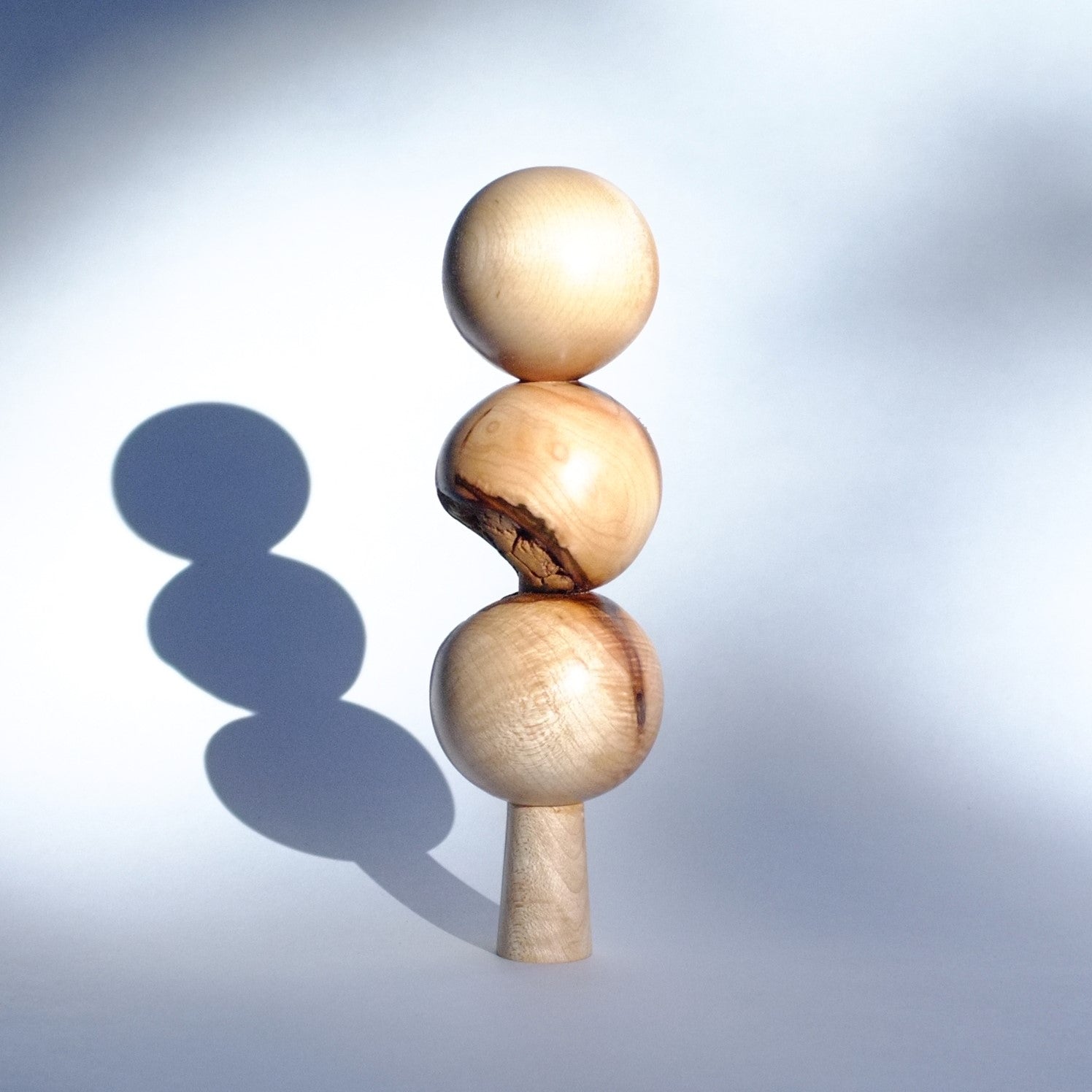 A knotty maple Prune Tree with three rounded balls and a visible central trunk through a heavily knotted section, celebrating the timber’s natural variation.