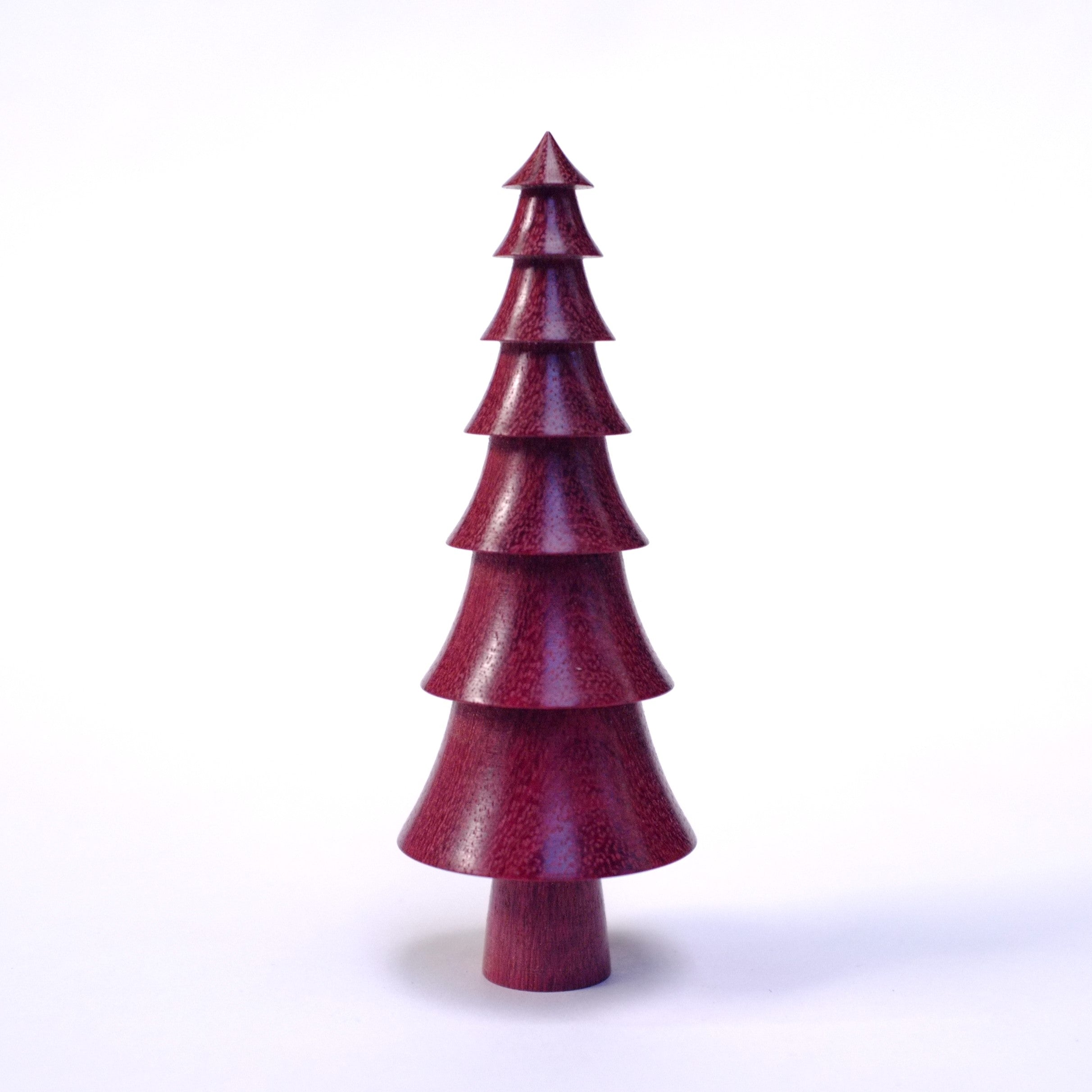 This Spruce Tree is handturned from purpleheart, its deep purple-red hues giving the piece warmth and a striking, distinctive presence.